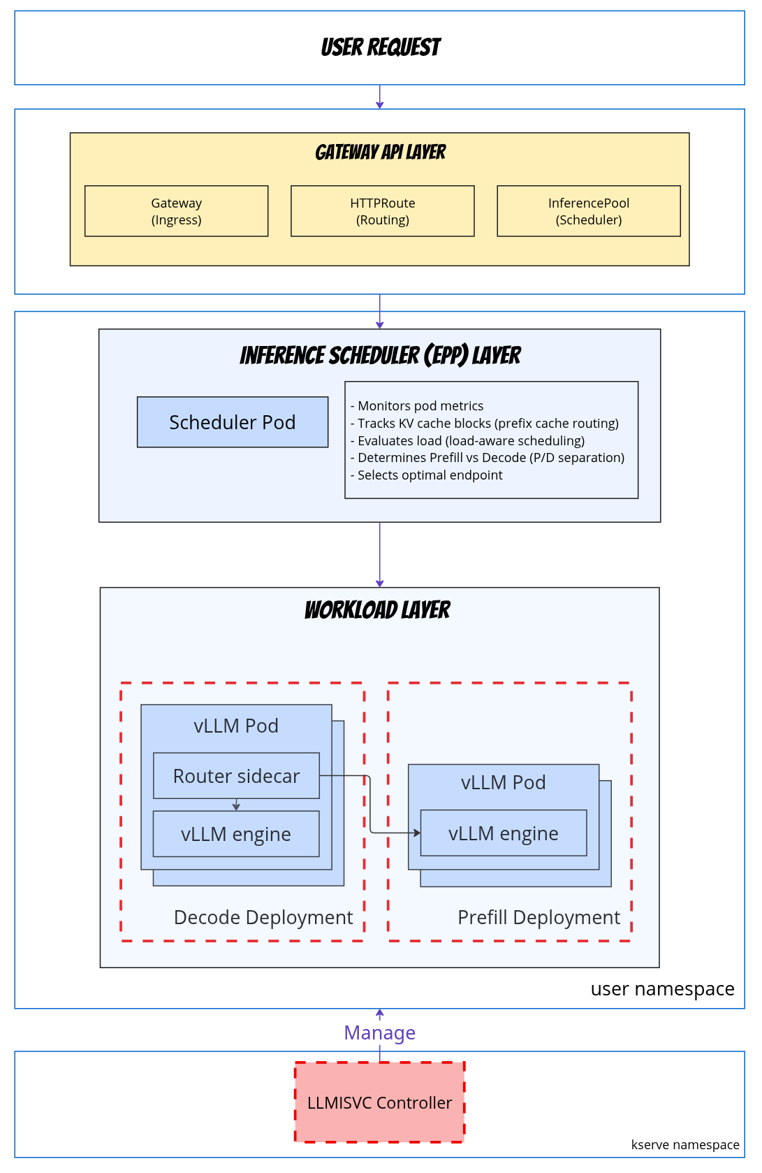 This guide provides an in-depth look at the LLMInferenceService architecture, component interactions, and advanced patterns for production deployments.